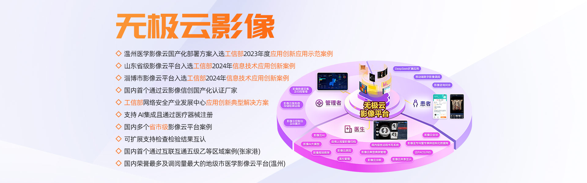 擁有多家年門診量400多萬以上人次的大型三甲醫(yī)院全院PACS及云影像案例,多個省市規(guī)模醫(yī)學影像云平臺案例,承建的溫州市醫(yī)學影像云平臺榮獲浙江省最多跑一次改革十佳案例、省領(lǐng)跑者定位題詞、全國惠民便民優(yōu)秀案例、基于影像云AI分析試點單位等榮譽。